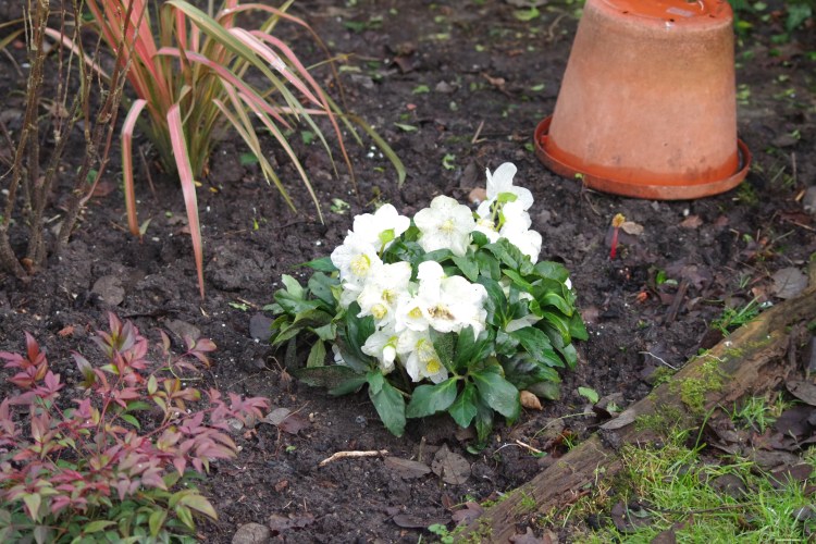 A little colour from the phormium jester, hellebore and by the plant pot a shoot of rhubarb is emerging