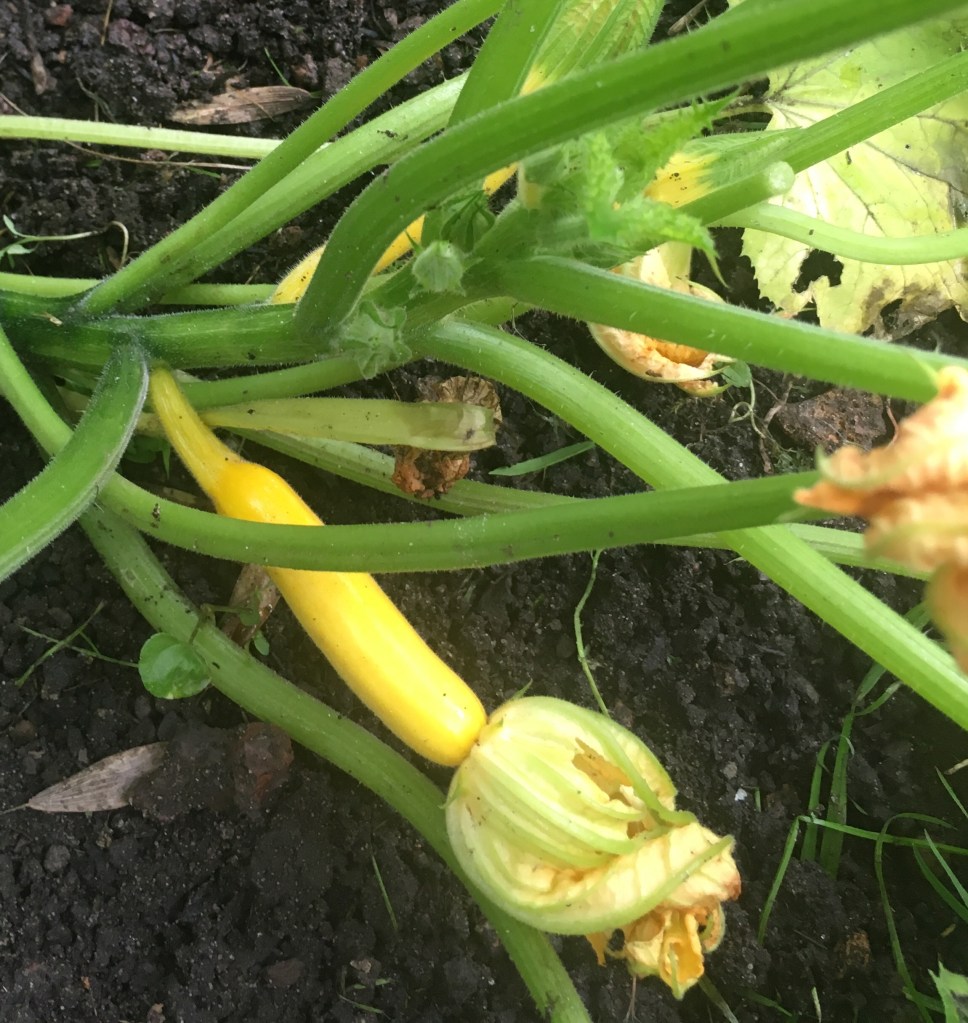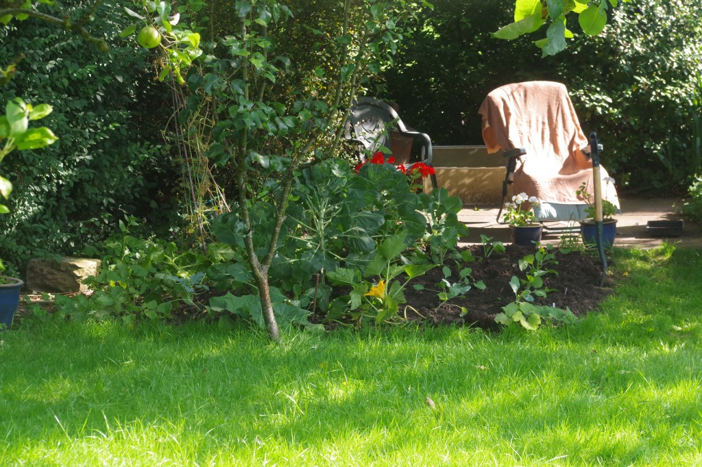In the vegetable patch the rust of the potatoes have been dug up and replaced by cabbages and cauliflowers. Small yellow courgette ‘soleil’ are slowly growing.