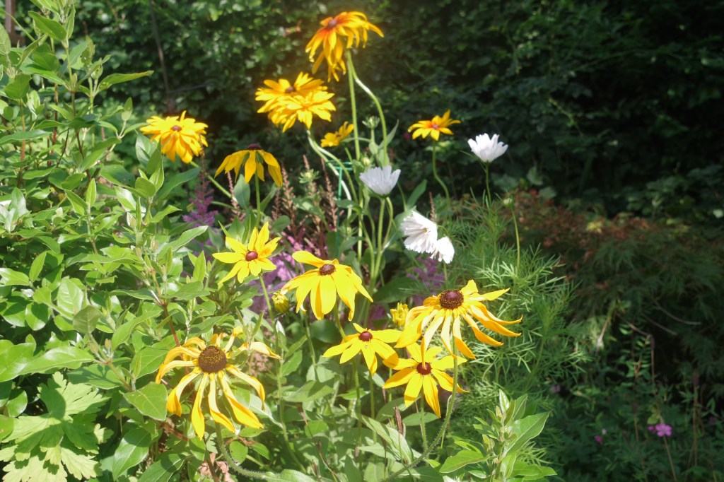 The sun has been shining and the flowers blossoming. Too hot to do much more than sit and enjoy the garden. A very pleasant surprise is the Rudbeckias which I have never grown before. The varied bright yellow and orange blooms brighten the August garden.
